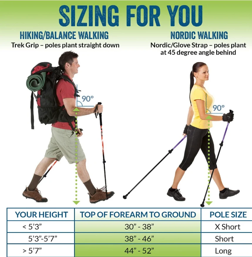 لمبا سائز (ان 5'7 "6'2 تک" کے لئے) توسیع شدہ کھمبے 115 سینٹی میٹر سے 135 سینٹی میٹر (45.25 "سے 53") تک ایڈجسٹ کرتے ہیں۔ ہر ایک کا وزن صرف 11 اونس ہے۔ جسمانی تناسب منفرد ہے ، لہذا سب سے زیادہ درست سائز کی پیمائش زمین سے اوپر کی چوٹی تک ہے جب زمین کے متوازی اور لمبا سائز ان لوگوں کے لئے ہوتا ہے جو 44 سے 52 سے زمین کی پیمائش کرتے ہیں۔