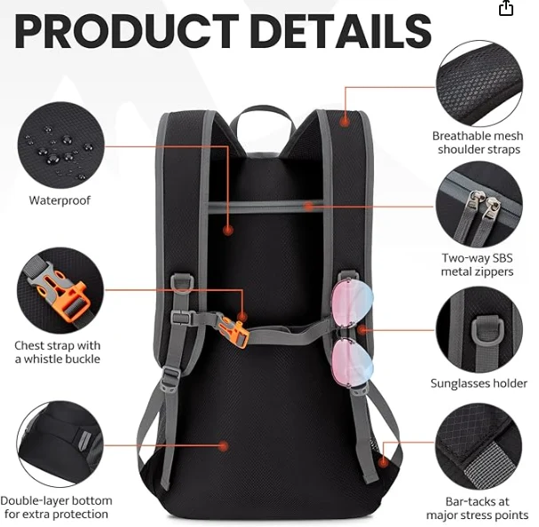 واٹر پروف پیدل سفر فولڈ ایبل بیگ ، ایک واٹر پروف گیلے جیب کو مرکزی ٹوکری میں شامل کیا جاتا ہے ، اس بیگ کے پچھلے حصے میں ایک زپر جس کی وجہ سے اندرونی گیلے جیب کا باعث بنتا ہے ، تاکہ تیراکی یا ورزش کرنے کے بعد پسینے والے کپڑے ، تولیے یا دیگر ذاتی چیزوں کو بہتر بنایا جاسکے۔